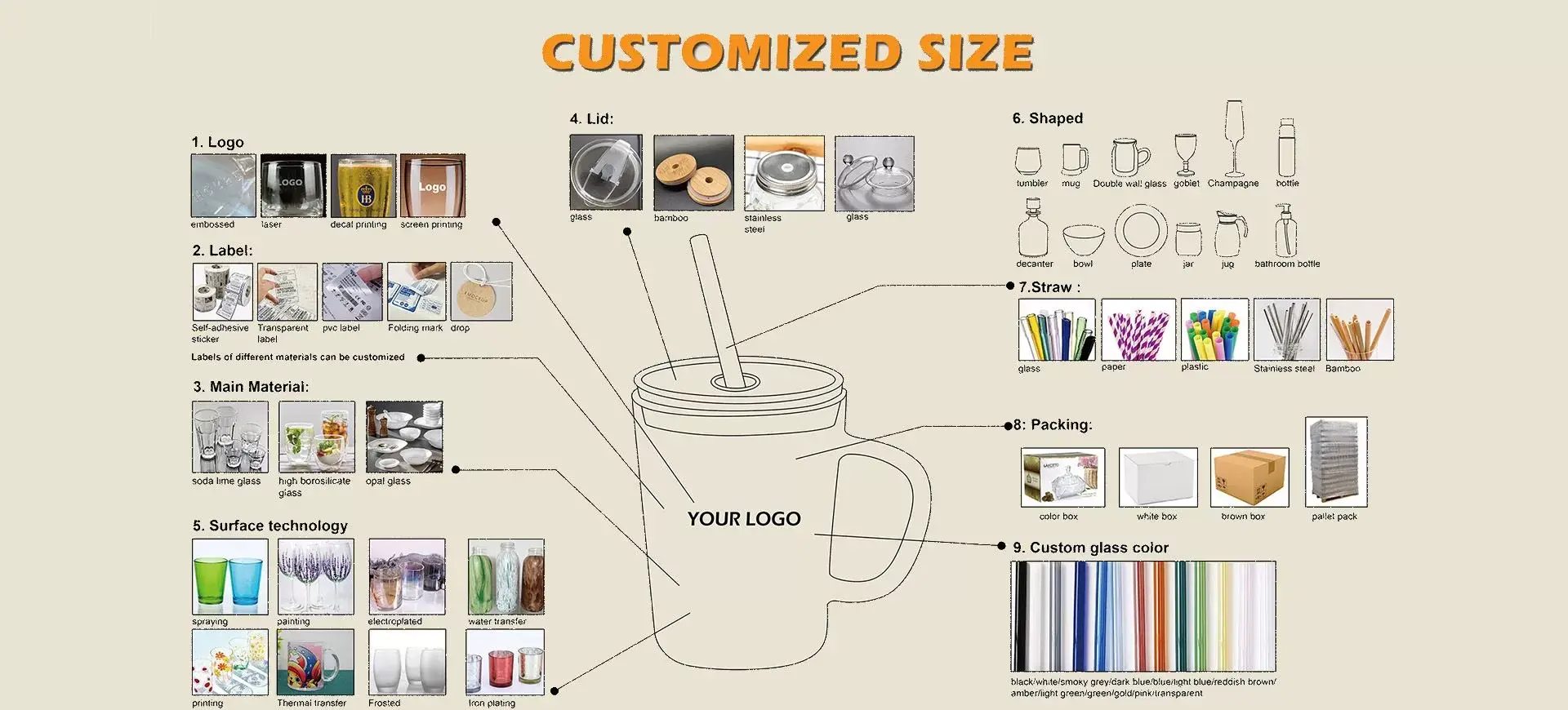 يتوفر زجاج مطبوع آليًا، أو منفوخ يدويًا أو آليًا. كما يتوفر أيضًا نقش بالرمل، أو ليزر، أو ألوان رش، أو طلاء يدوي، أو طلاء كهربائي، أو طباعة حريرية.